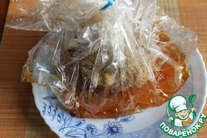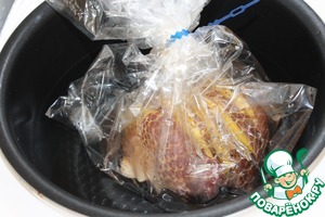 Далее укладываем в мешок для запекания, очень хорошо завязываем, чтоб в него не попала вода, заливаем кипятком, чтоб мясо было полностью покрыто