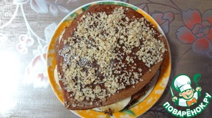 Затем сверху положить еще один панкейк. Из четырех слоев собираем тортик. Последний слой поливаем карамелью и посыпаем тертыми грецкими орехами.