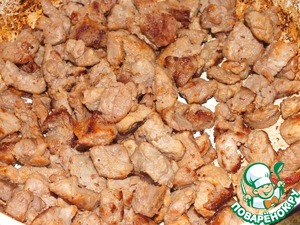 В этом рецепте ингредиенты берутся на глаз. Я напишу, сколько продуктов мне потребовалось. Мясо нарезать небольшими кусочками, обжарить на растительном масле