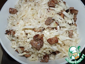 Смешать мясо, нашинкованную капусту и рис. Добавить стакан воды и тушить с закрытой крышкой на маленьком огне минут 10-15