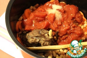 Добавить туда же рубленые томаты в собственном соку, посолить, поперчить по вкусу. Я еще добавляла щепотку тимьяна и несколько горошин черного горького перца. Налить литр горячей воды. Закрыть крышку мультиварки. Дальше я готовила в режиме "Мультиповар". Выставила температуру 150 градусов и время - 1 час.
