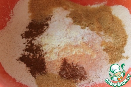 К муке добавляем: сахар, соль, корицу, мускатный орех, шафран, имбирь, ванилин, соду и разрыхлитель, перемешать.