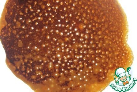 Поверхность блина сразу начинает покрываться пузырями, как верх подсохнет, переворачиваем на другую сторону. -