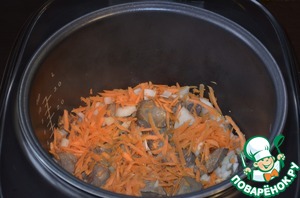 Включить мультиварку в режим «Поджаривание», обжаривать потроха около 10 минут.