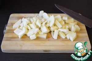 Пока обжариваются субпродукты и овощи, почистить и порезать картофель кубиками.