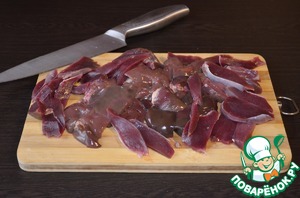 Потроха необходимо хорошо вымыть, порезать пластинками. -