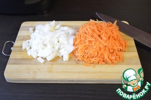 Морковь натереть на крупной терке, лук порезать маленькими кубиками.