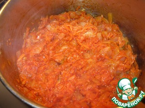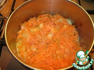 На дно толстостенной кастрюльки (или казанка) льем 1 стол. ложку подсолнечного масла и поджариваем на нем измельченную луковицу