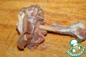 В это время необходимо вынуть косточку из голени. Аккуратно отделяя мясо от кости, сдвигать его чулком к суставу и отрезать косточку, оставив небольшую часть суставчика