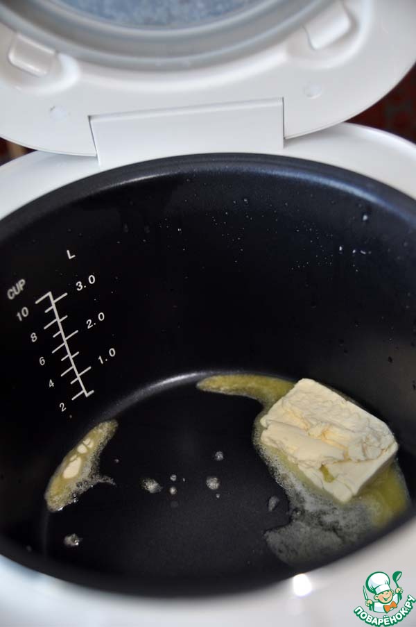 Кладём в чашу мультиварки кусочек сливочного масла, растапливаем.