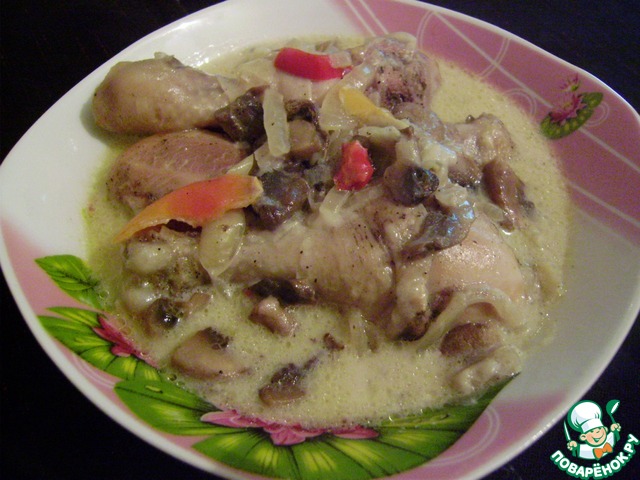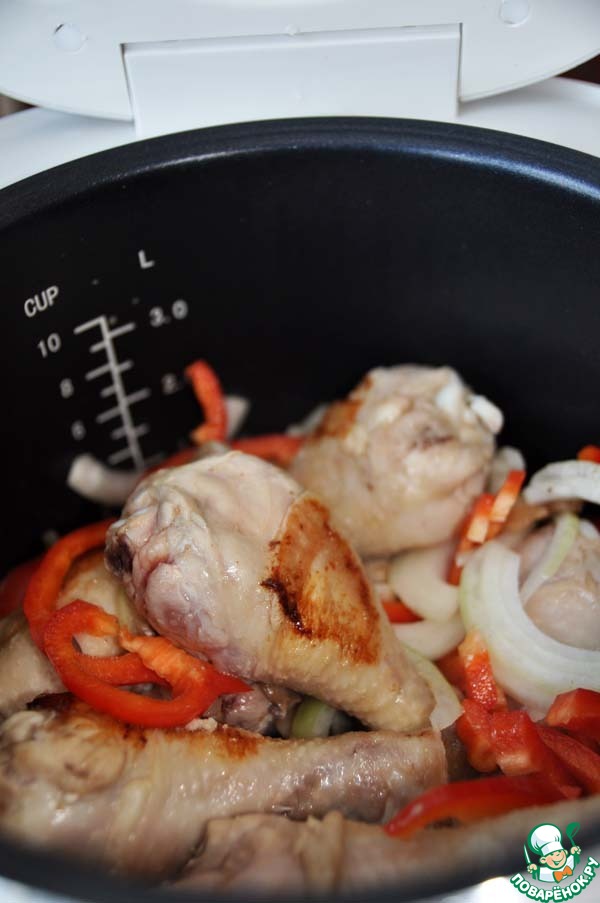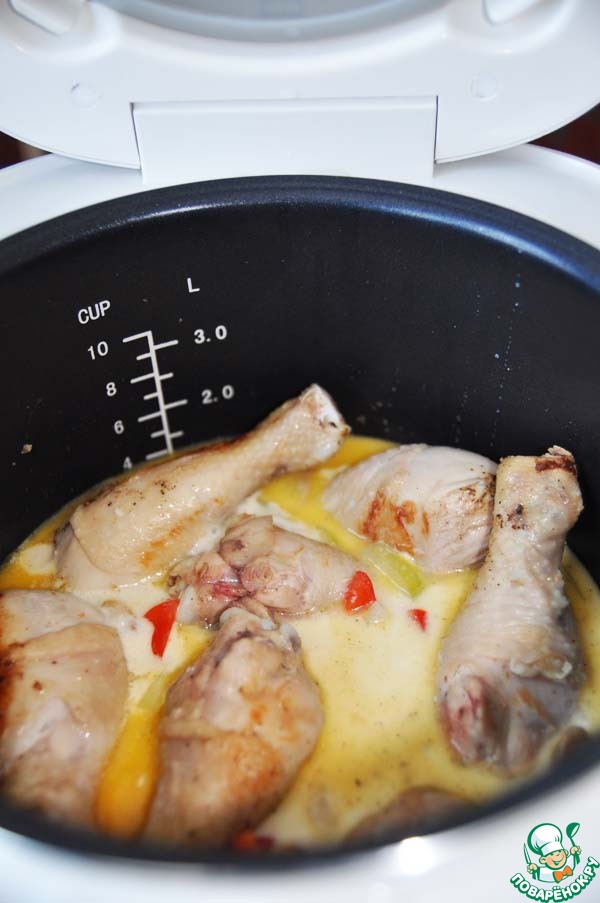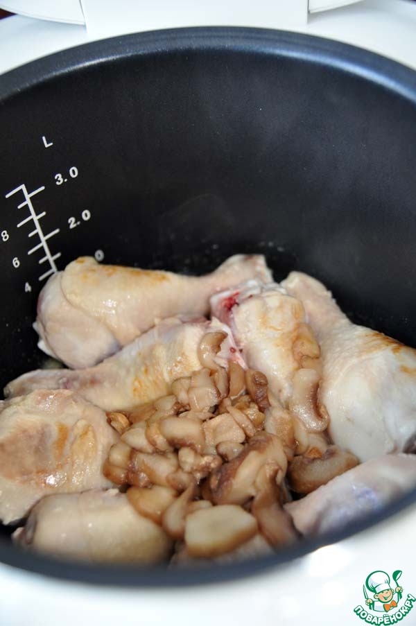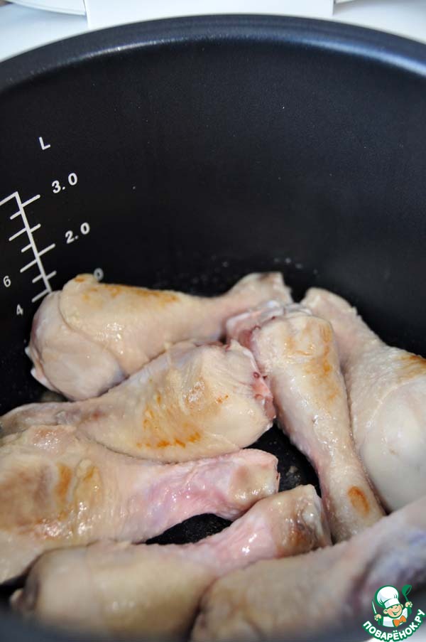 Далее кладём куриные голени и обжариваем при открытой крышке, переворачивая с помощью лопатки.
