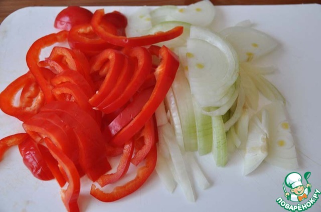 Тонкими полосками нарезаем красный болгарский перец и полукольцами лук.