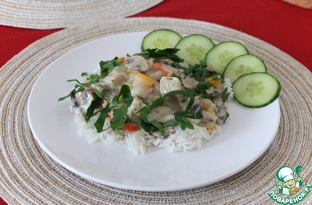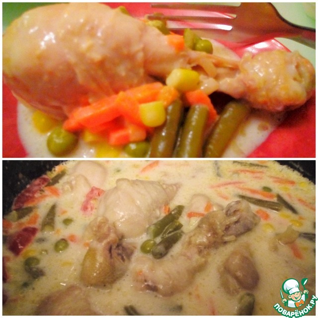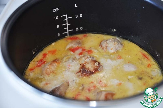 Добавляем молоко с крахмалом к курице, перемешиваем. Крышку закрываем.