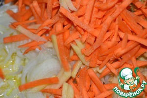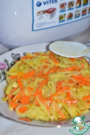 Морковь и картофель порезать соломкой или (как поступила я - натереть на терке с насадкой для картофеля-фри).
