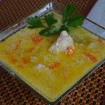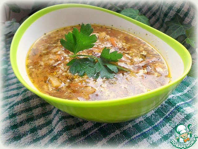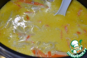 За 10 мин. до окончания режима "Суп", добавляем обжаренные овощи и хорошо перемешиваем. А за 5 мин. до окончания программы, выливаем яично-сливочную смесь.