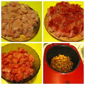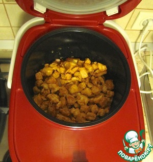 Куриное филе нарезать кубиком, посолить по вкусу, посыпать сладкой паприкой. Включить режим "поджаривание", влить растительное масло, подготовленное мясо обжарить до золотистого цвета, переложить в блюдо, накрыть фольгой.