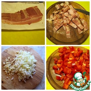 Бекон нарезать произвольно на полоски, лук накрошить кубиком, чеснок измельчить, перец очистить и нарезать крупным кубиком.