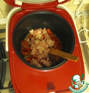Добавить нарезанный болгарский перец, бекон, обжарить несколько минут.