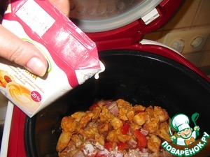 Влить 300 мл сливок (100 мл оставить), все перемешать, попробовать на вкус. Включить режим "тушение" на 50 минут.