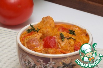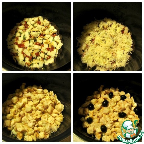 Выложить в чашу сверху сухариков измельченные томаты, чеснок, тимьян. Сверху высыпать половину сыра. Выложить кусочки куриного филе, маслины.