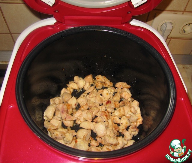 Включить режим "Поджаривание", налить растительное масло, обжарить кусочки филе до легкой золотистости (важно не пересушить, чтобы сок остался в мясе!).