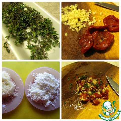 Измельчить тимьян, чеснок, томаты, перемешать. Два вида сыра соединить.