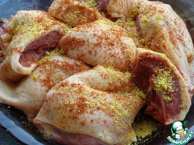 Домашнюю уточку (у кого нет утки, можно заменить курицей) нарезаем порционно, посыпаем солью, перцем, любимыми специями, даем настояться минут 30. Можно и больше.