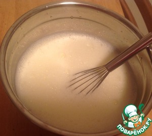 Итак, яйца, соль, сахар и соду взбиваем венчиком, постепенно вводим молоко и всё вместе взбиваем. -