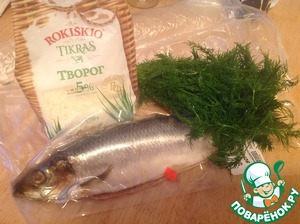 Для начинки нам потребуется филе не слишком солёной сельди, свежий творог и укроп + ложка сметаны для нежности, по желанию. -