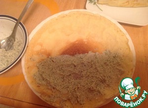 Итак, кладём полную столовую ложку начинки, размазываем по половине блина. -