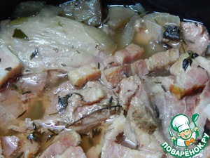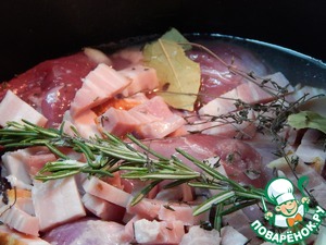 К обжаренному луку и грибам выкладываем в чашу мультиварки бекон и мясо, целую луковицу. Добавляем лавровый лист, тимьян, розмарин, перец и соль. Добавляем 1 мультистакан воды. Выбираем режим "Тушение". Нам надо тушить 100 минут.