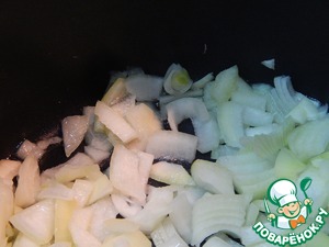 Включаем нашу мультиварку VITEK VT-4210 на режим "Поджаривание", обжариваем лук с кусочком утиного жира. Добавляем грибы.