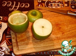 У яблок срезать верхушку толщиной примерно 1,5 см, аккуратно удалить мякоть из яблок. Мякоть и яблоки полить лимонным соком.