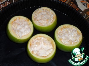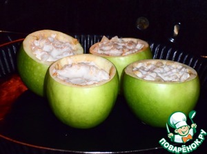 Творожно-фруктовую смесь разложить в яблочки и поставить в предварительно разогретую до 180 градусов духовку примерно на 35-40 минут. За 10 минут до готовности положить на яблоки срезанные верхушки.