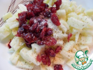Яблоко нарезаем кубиками, добавляем клюкву, солим и перчим, слегка перетираем руками.