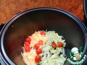 Лук нарезаем и выкладываем в чашу мультиварки, выбираем режим Поджаривание и обжариваем 5 минут в оливковом масле, добавляем помидоры (у меня черри).