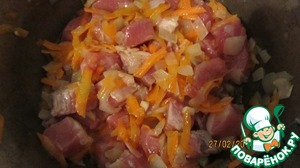 Мясо посолить и добавить к луку с морковью, сало мелко нарезать и тоже в казан, обжарить минут 15.
