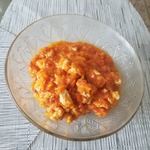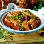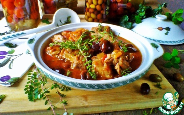 С помидор снять кожицу, размять вилкой и добавить к мясу, хорошо перемешать и тушить минут 15. Оливки разрезать на 4 части, добавить к мясу, хорошо перемешать и залить водой.