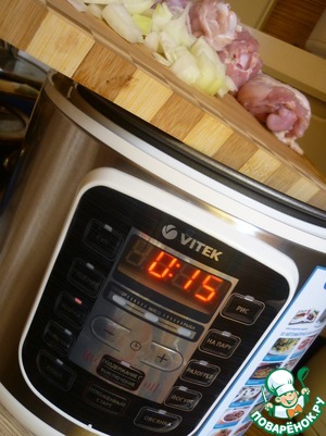 Для начала устанавливаем программу "Жарка" на 15 минут, распускаем в чаше сливочное масло и обжариваем, периодически помешивая, курицу с нарубленным репчатым луком. -
