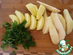 Пока суп варится, рубите петрушку. Яблоки и груши чистите от кожицы и семян и режете на 8 частей.