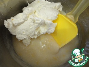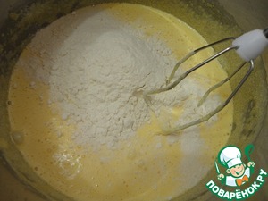 Желатин замочить 0,5 стак. воды. Разогреть духовку на 210 гр. Взбить яйца с сахаром в густую пышную массу. Добавить муку и аккуратно перемешать снизу вверх лопаткой.