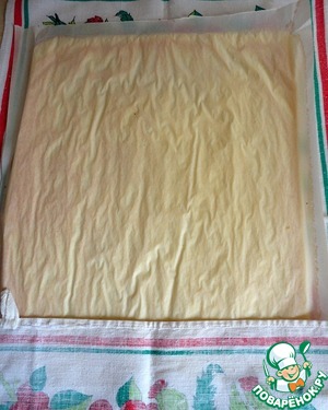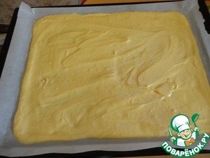 Выстелить противень пергаментом, равномерно выложить бисквитную массу и выпекать 7 минут.