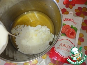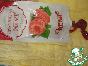 Смазать корж малиновым джемом (немного оставить для украшения).