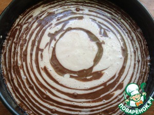 В форму, смазанную маслом, в центр по 2 ст. л. выкладываем темное, затем светлое тесто. Ставим пирог в духовку на 40 мин при 180 гр