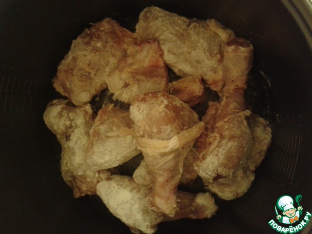 Окорочка помыть, разрезать пополам; натереть их солью и перцем, обвалять в муке. В чашу мультиварки налить масло, положить туда курицу и поставить на режим "Выпечка" (жарка) на 40 минут, в течение 15 минут курицу перевернуть один раз