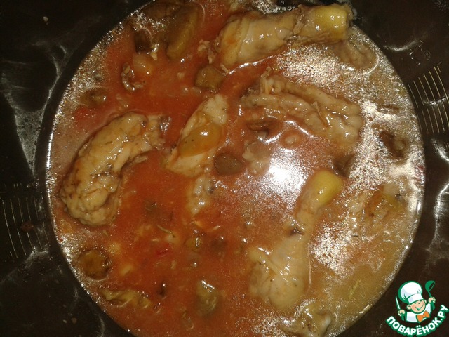 Томатную пасту разводим в одном стакане воды, добавляем к курице по окончании жарки и ставим в режим "Тушение" на 1 час