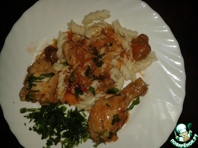 Это блюдо я готовлю в мультиварке. Курица получается вкусная, пикантная; гарнир может быть любой рис, картошка, макароны... всем приятного аппетита.