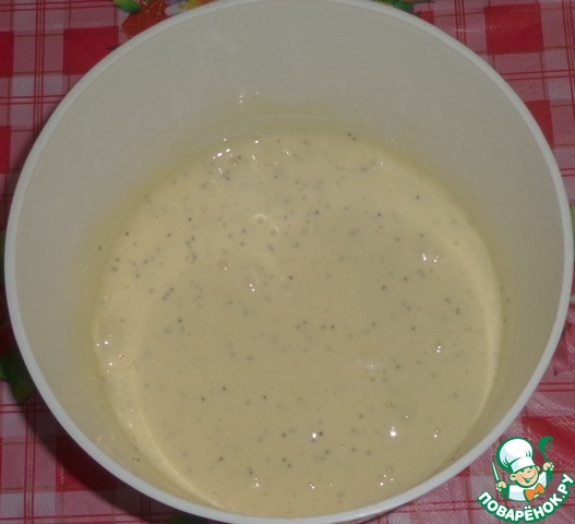 • Приготовим бисквитное тесто: желтки отделить от белков. Желтки взбить с сахаром и к ним вмешать муку. Белки взбить с щепоткой соли в крепкую пену и добавить в тесто. Всё хорошо перемешать. В тесто добавить мак.