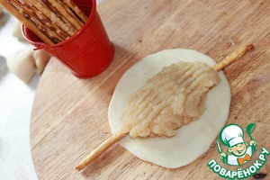 От теста отщипываем кусочки (размером с грецкий орех), раскатываем не слишком тонкие лепёшки. Кладём на них по центру солёную соломку и фарш