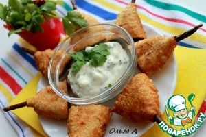 Подаём с соусом. У меня майонез, сливки, чеснок, зелень кинзы и белый перец.